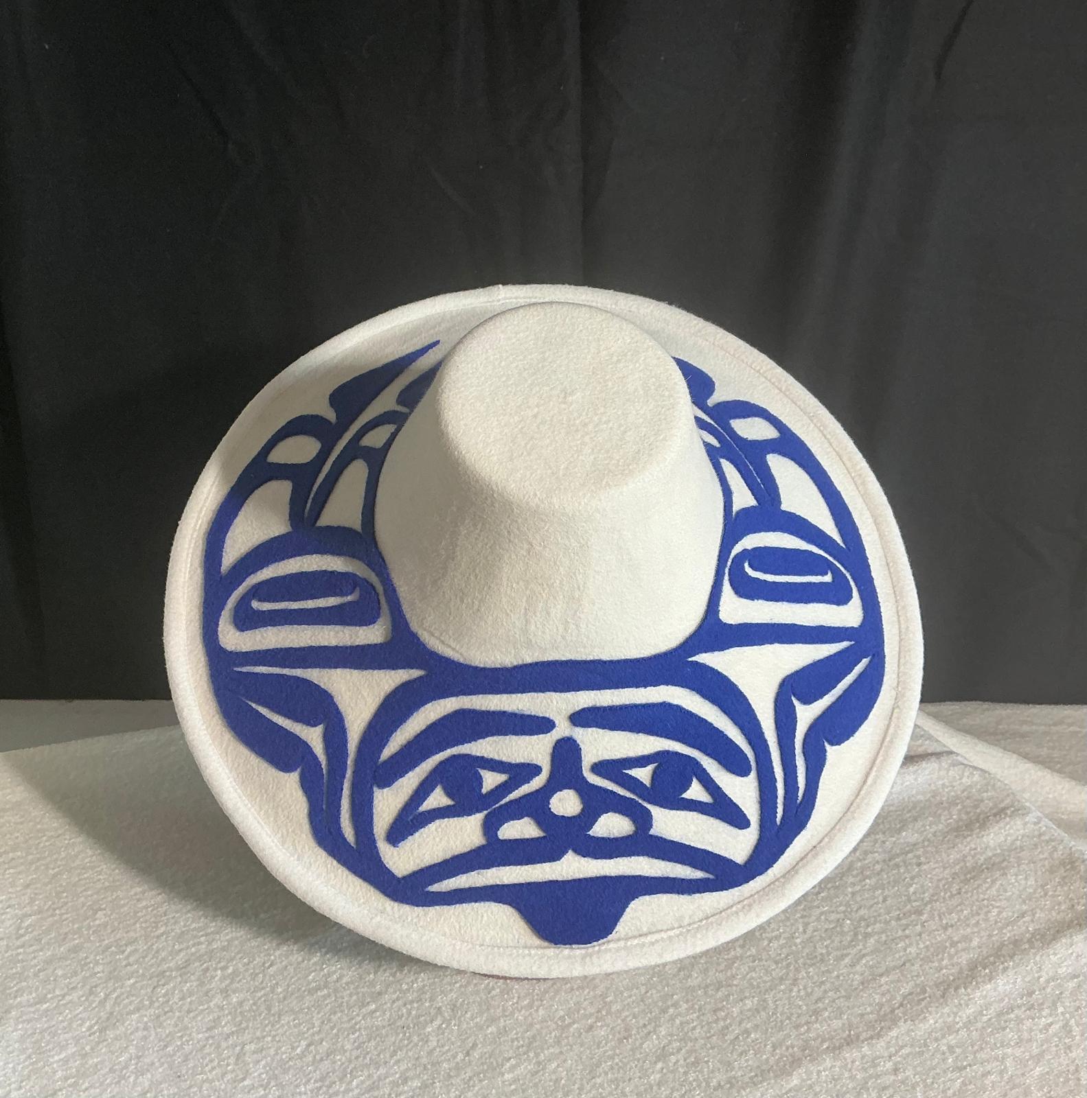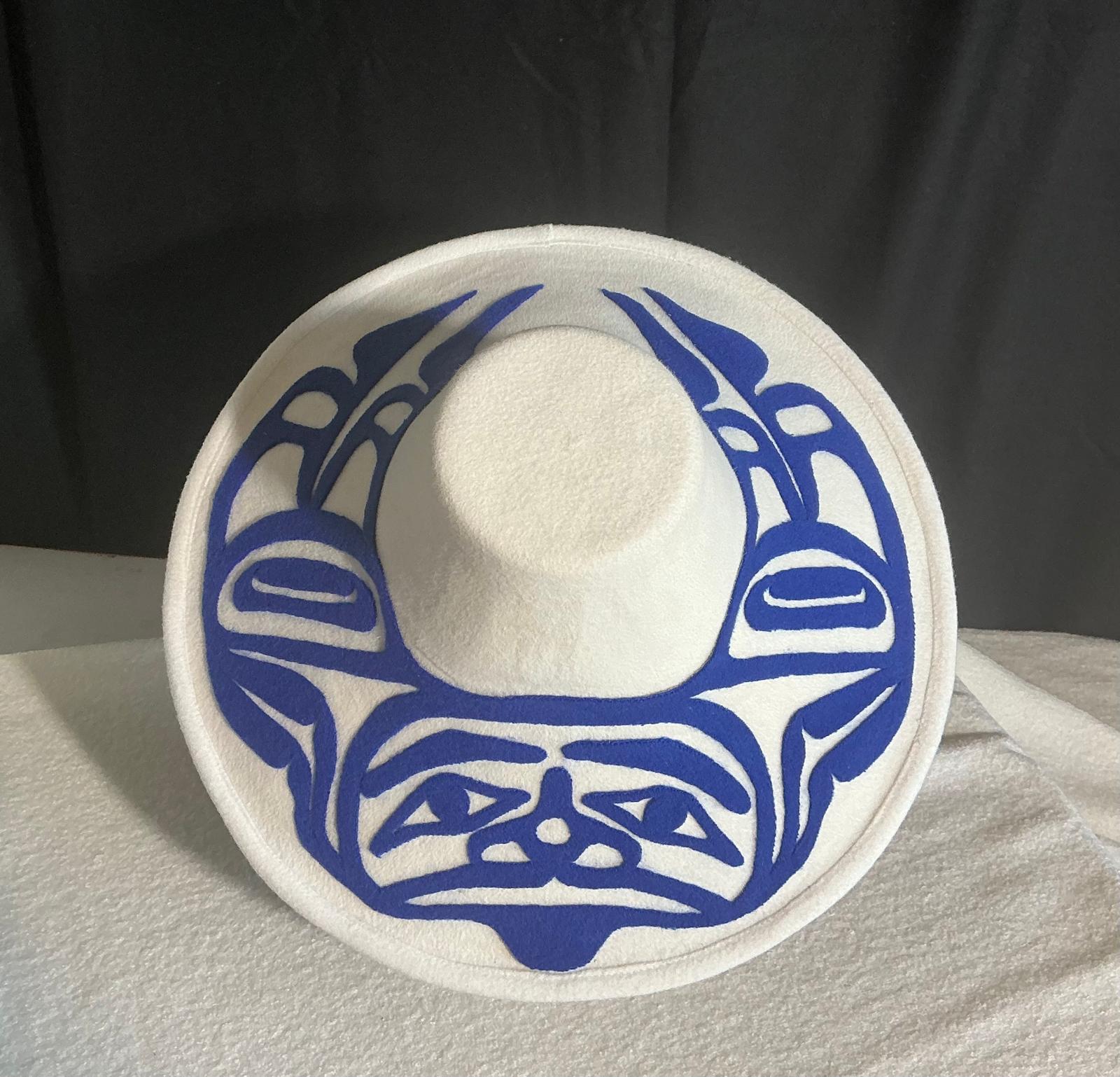 Human Transformation Hat, in White Furfelt (angora) with royal blue artwork, is all hand cut, one of a kind hat. The shape is a Northwest Coast hat, but made with contemporary materials. Dorothy is the first to innovate in this millinary process. She has been a skilled Millinar for 38 years. Her hats are treasured and used for many reasons, such as weddings, speaking, graduations, traditional dancers and singers, and she has made them for rock stars too!