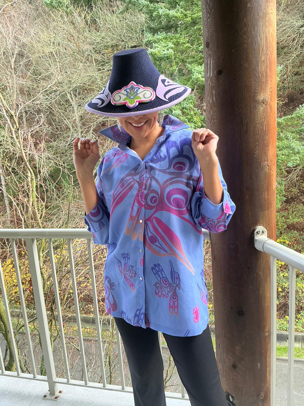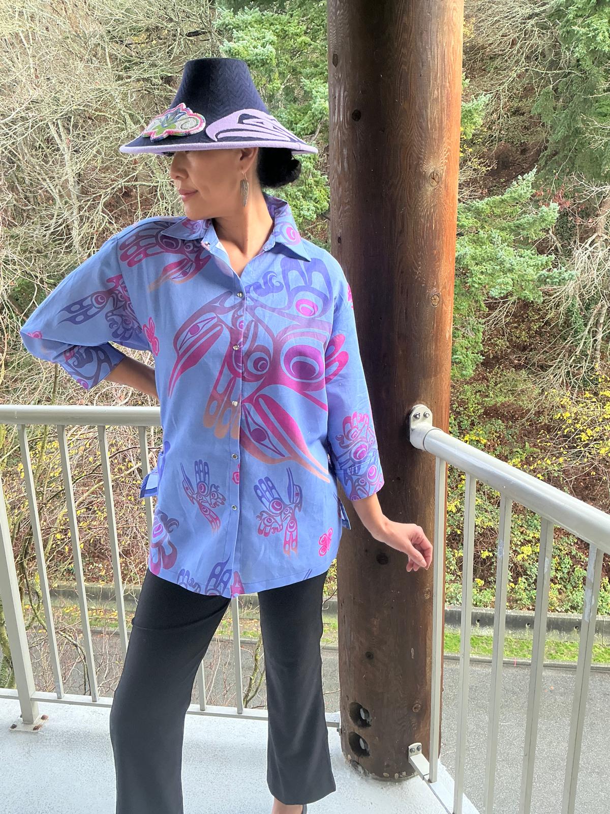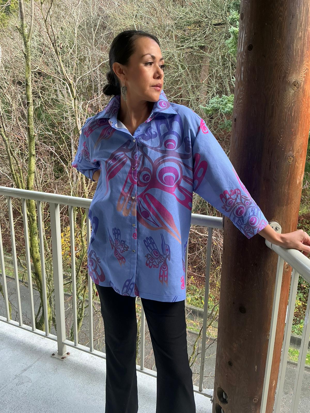 The hummingbird Snap Button Blouse is an elegant long length that covers to mid thigh, with side slits. and a cuffed sleeve. The fabric is custom printed with a hummingbird design in lovely mint color, navy and green tones. or Jeweled Lilac tones. It comes in a sleeveless version.